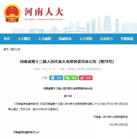 《河南省綠色建筑條例》已經河南省第十三屆人民代表大會常務委員會第二十九次會議于2021年12月28日審議通過,現予公布,自2022年3月1日起施行。
