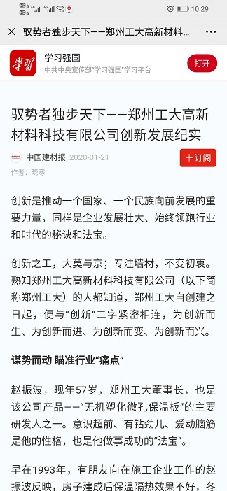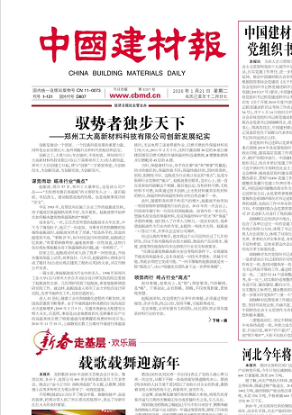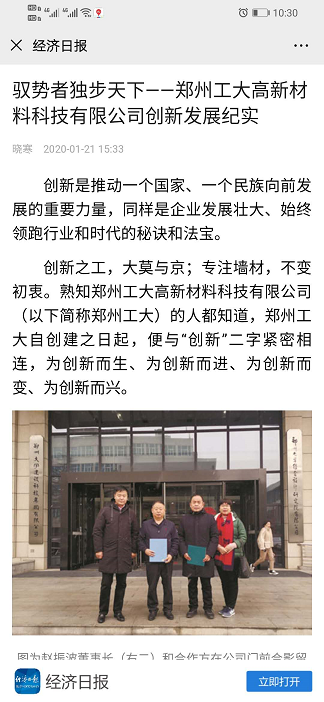 2020年1月21日,《中國(guó)建材報(bào)》在頭版頭條位置,刊發(fā)了本公司長(zhǎng)篇紀(jì)實(shí)通訊《馭勢(shì)者獨(dú)步天下——鄭州工大高新材料科技有限公司創(chuàng)新發(fā)展紀(jì)實(shí)》,文中對(duì)公司發(fā)展歷程進(jìn)行記述的同時(shí),對(duì)公司產(chǎn)品“無(wú)機(jī)塑化微孔保溫板”給予了高度評(píng)價(jià),文章說(shuō):“無(wú)機(jī)塑化微孔保溫板”不僅占領(lǐng)了保溫墻材行業(yè)的“高點(diǎn)”,也徹底解決了國(guó)內(nèi)節(jié)能建筑防火與保溫不能兼容的行業(yè)窘迫局面。隨后,學(xué)習(xí)強(qiáng)國(guó)、經(jīng)濟(jì)日?qǐng)?bào)公眾號(hào)全文轉(zhuǎn)發(fā)。文章全文如下: