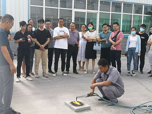 在車間外,我司工作人員現(xiàn)場演示了無機(jī)塑化微孔保溫板的吸水性、防火性、熱工性能等特點(diǎn),引起設(shè)計(jì)院專家的嘖嘖稱贊。